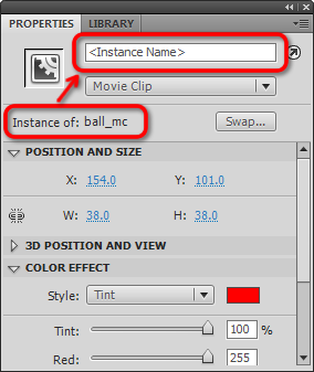 This is the key to how we can differentiate between multiple instances (or copies) of the same movieClip. Let's give each instance of ball_mc a unique instance name. One will be ball1 and the other ball2: