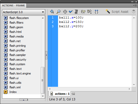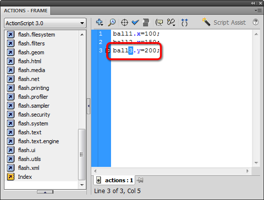 Let's modify that code... we'll keep setting the x position of ball1 and ball2, but let's try changing the y position of ball3 (don't worry that ball3 doesn't "exist" yet):