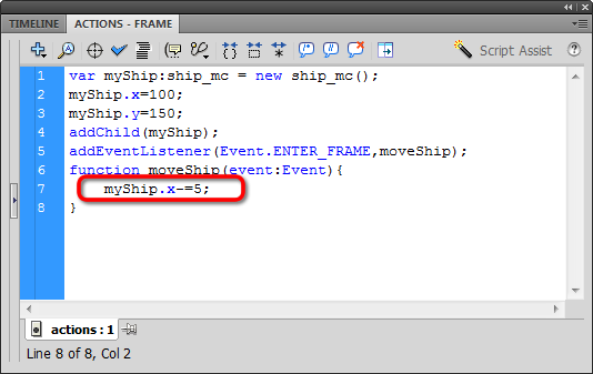 If you think the X position of myShip will move five pixels to the left every time the moveShip function is called, you're correct!