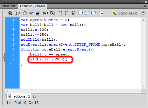 Now we tell Flash what we want it to do if the condition is true. We only want it to do one thing (ball1.y=0) and then we close the if statement with a right brace:
