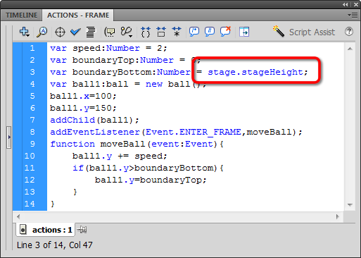 But what if we want to change the size of our Stage later? We would have to go back and change our ActionScript as well! A better solution, is to have Flash use it's built-in ability to lookup the value of the Stage height property for us.
