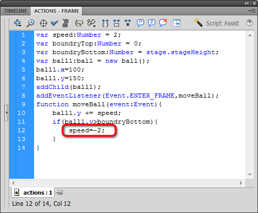 Open the Actions window and let's think about how we can reverse the direction of ball1. Right now, we are resetting the Y position when it is greater than the Stage height. Instead of resetting the Y position, let's reset the variable speed to be a negative number: