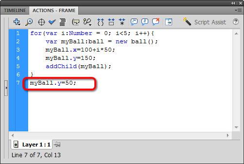 How do we refer to the instances of ball now? Let's add another command setting the Y position of myBall outside the for loop: