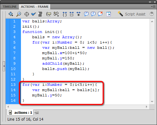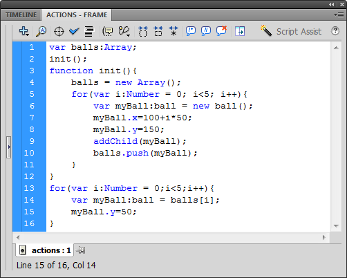 What we want to do is animate.... we've got the making of the with our for loop. Think way back to the first time we animated a single ball. We used the ENTER_FRAME event listener to run the moveBall function over and over again: