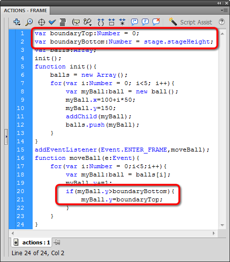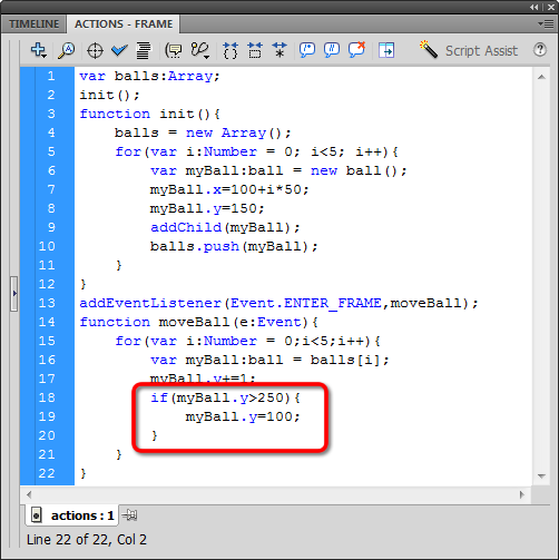 ...and just like before, we'll reset the Y position of each ball when it hits the bottom boundary. Let's do a quick statement setting the Y position to 100 whenever Y is greater than 250: